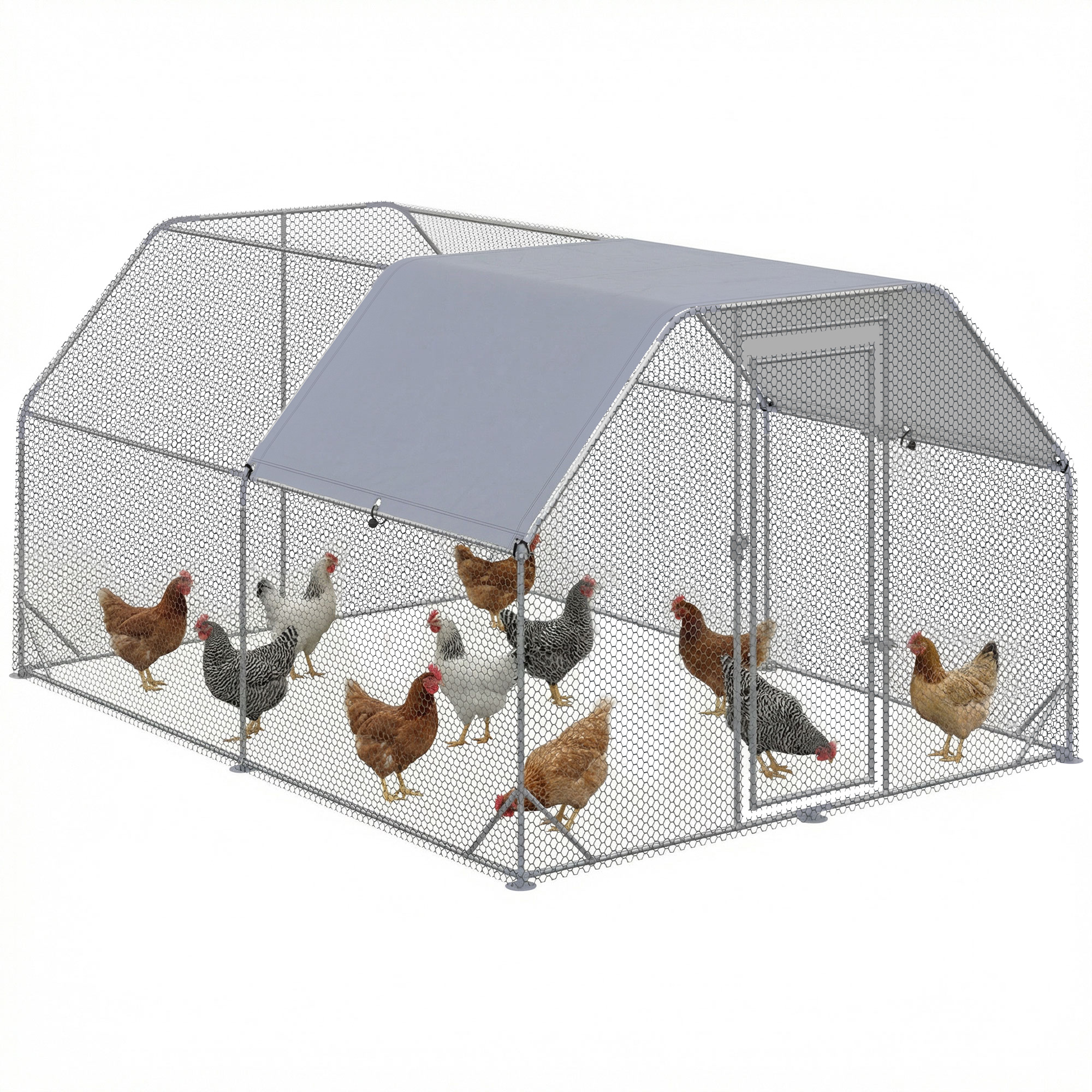 PawHut Chicken Run, Galvanized Large Metal Chicken Coop Cage, Walk-in Enclosure Poultry Hen Run House Playpen Rabbit Hutch with Flat Roof, Cover, 9.2' x 12.5' x 6.5', Silver