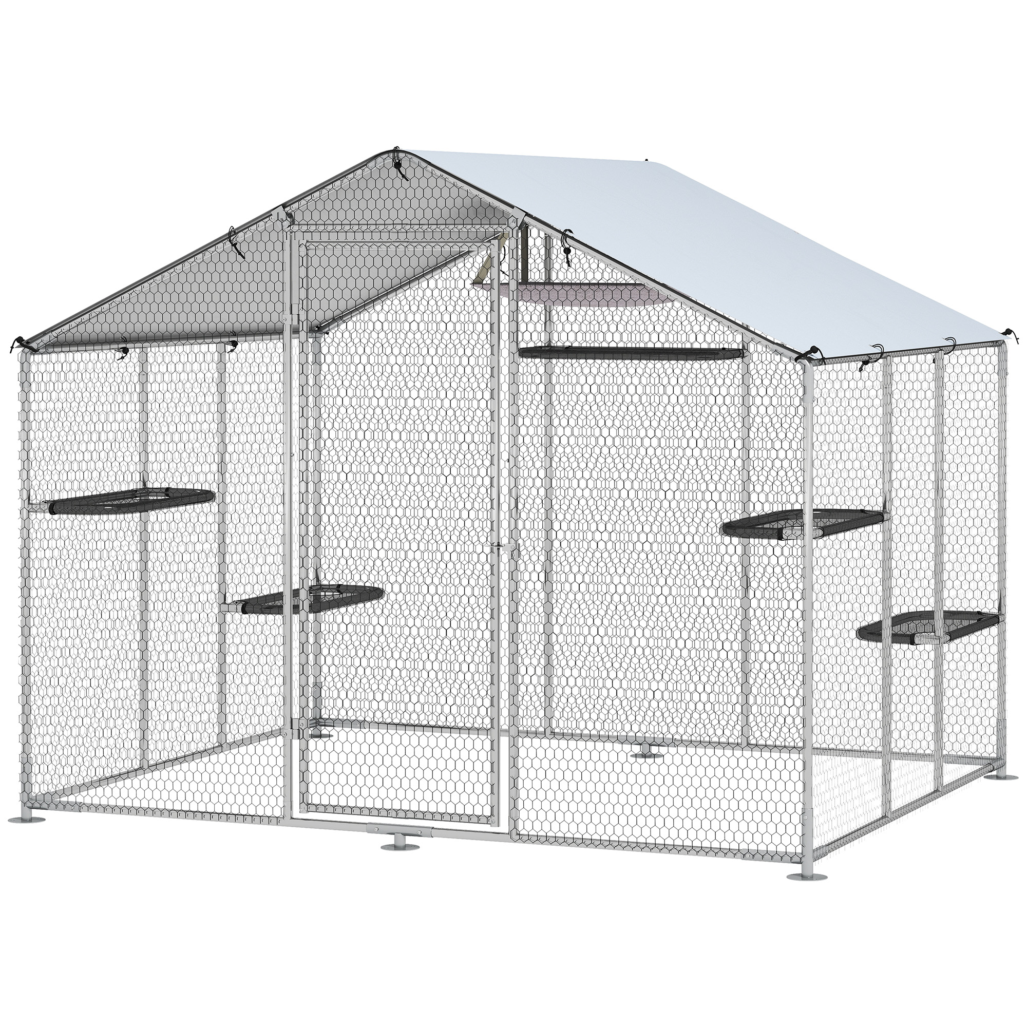 PawHut Chicken Run, Galvanized Large Metal Chicken Coop Cage, Walk-in Enclosure Poultry Hen Run House Playpen Rabbit Hutch with Flat Roof, Cover, 9.2' x 6.2' x 6.5', Silver
