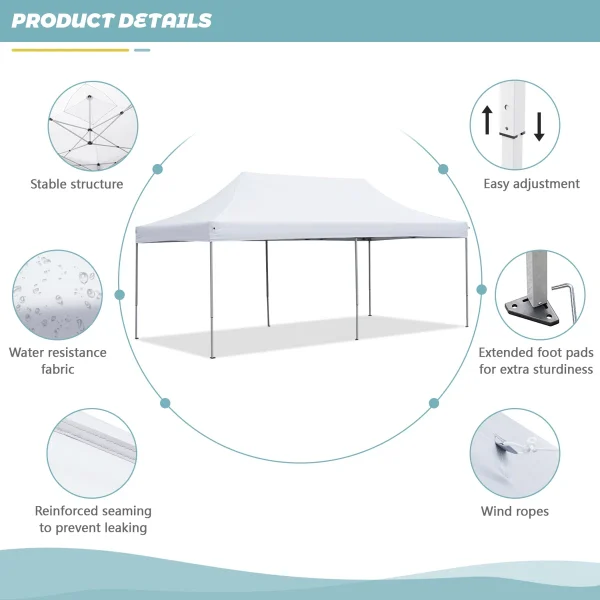 A Sturdy & Reliable Shelter for Various Outdoor Activities! With dimensions of 10 x 20 ft and a height of 9.7-10.4 ft (3-level adjustable), our pop-up canopy tent provides generous space to accommodate approximately 15-20 people. Its versatility makes it suitable for a wide range of outdoor activities, including camping, backyard gatherings, beach sun shelters, lawn weddings, markets, and more. Besides, the tent is supported by a heavy-duty powder-coated metal frame and durable oxford fabric canopy, ensuring long-term outdoor use. And the canopy fabric with silver coating, providing excellent UPF50+ sun protection. Setting up the canopy tent is incredibly simple and hassle-free, thanks to its convenient pop-up design. And there exists a portable carrying bag for easy transportation and storage. To prolong its service life, we recommend not leaving the tent under bad weather conditions.
