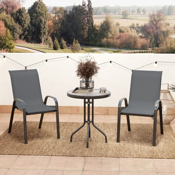 Brighten your outdoor space with this outdoor bistro set, a charming bistro or chic lounge addition for small spaces. This balcony furniture set has two stackable armchairs and a round glass-top table. Powder-coated steel frames offer a strong outdoor table and chairs. Featuring a breathable mesh seat, sloping high back, and supportive curved armrests, this patio conversation set is a stunning and cozy corner for friend hangouts, daily talk, and sunset viewing.
