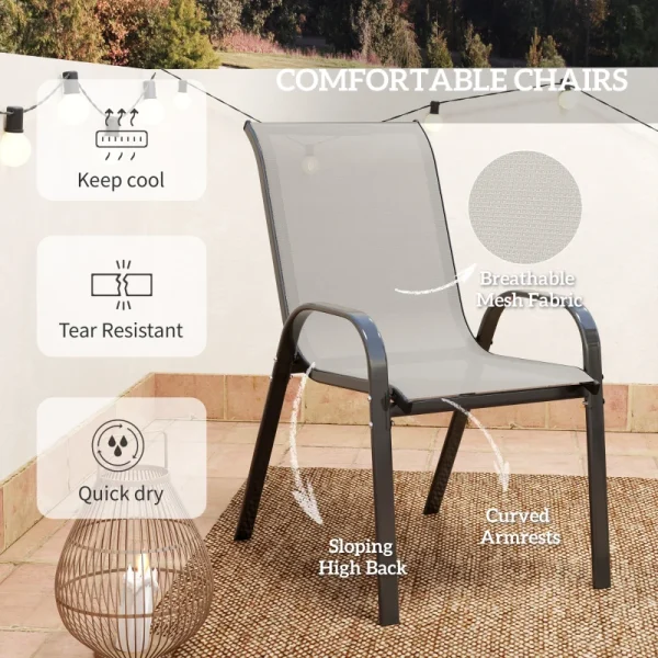 Stackable Chairs: Designed with practicality in mind, these stackable patio chairs can be easily stored away to save you valuable space. Sink into the comfort with curved armrests and a sloping high back.
