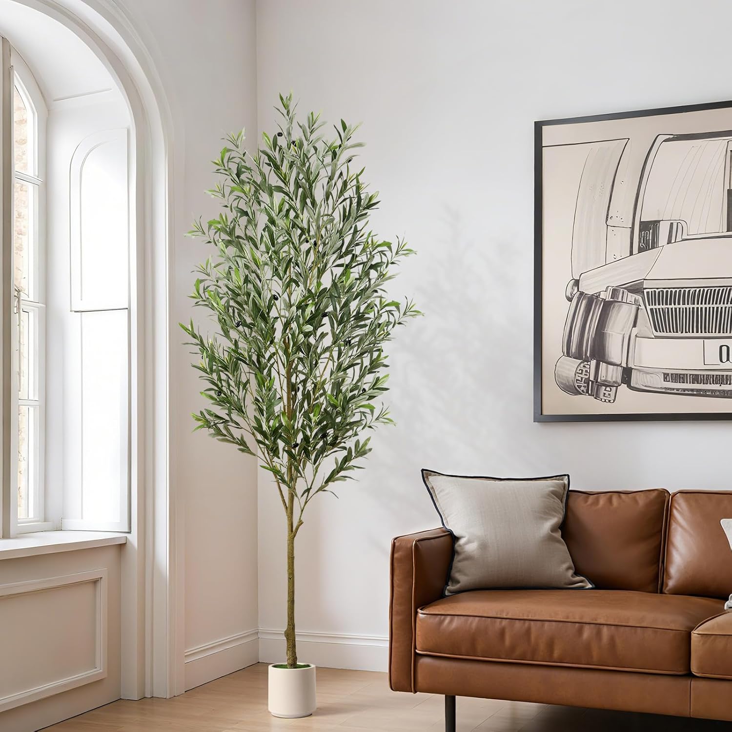 Artificial Olive Tree 8ft Faux Olive Trees with White Planter, Fake Olive Plant with Realistic Branches and Fruits Tall Fake Plants for Indoor Modern Home Office Living Room Decor Housewarming