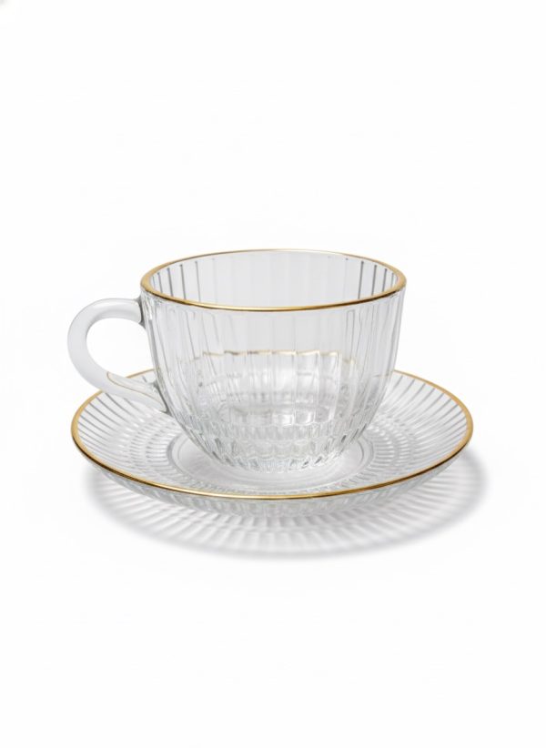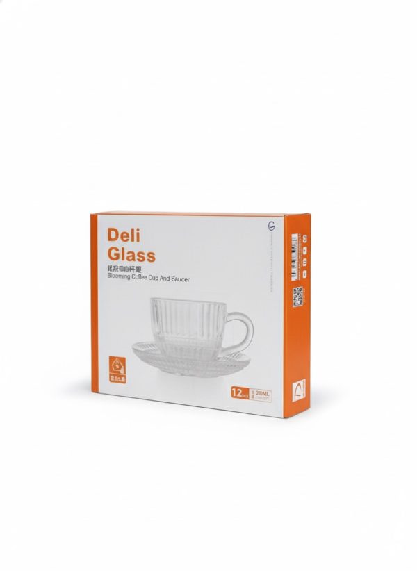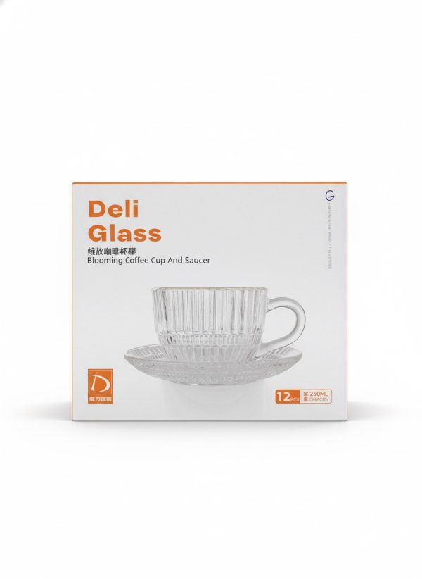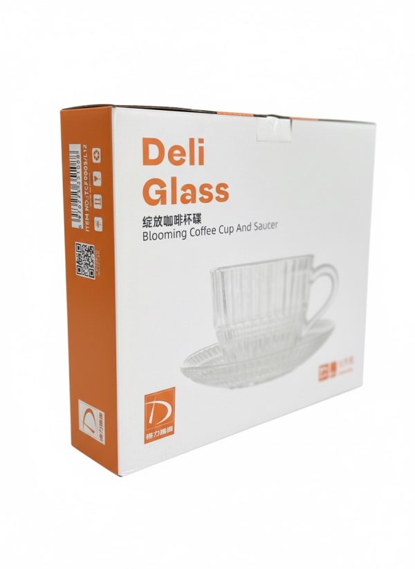The product is a Deli Glass “Blooming Coffee Cup And Saucer” set.