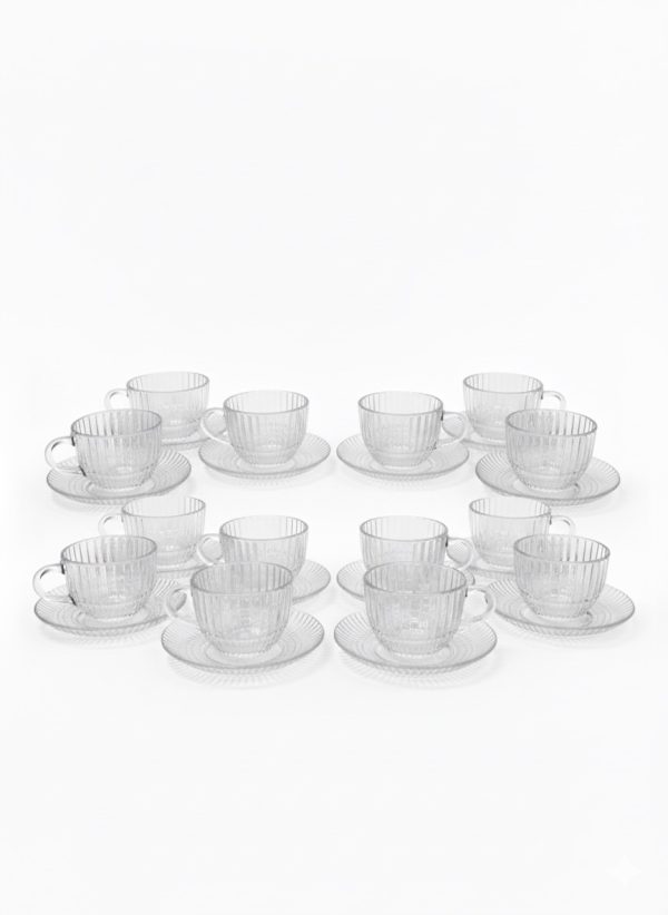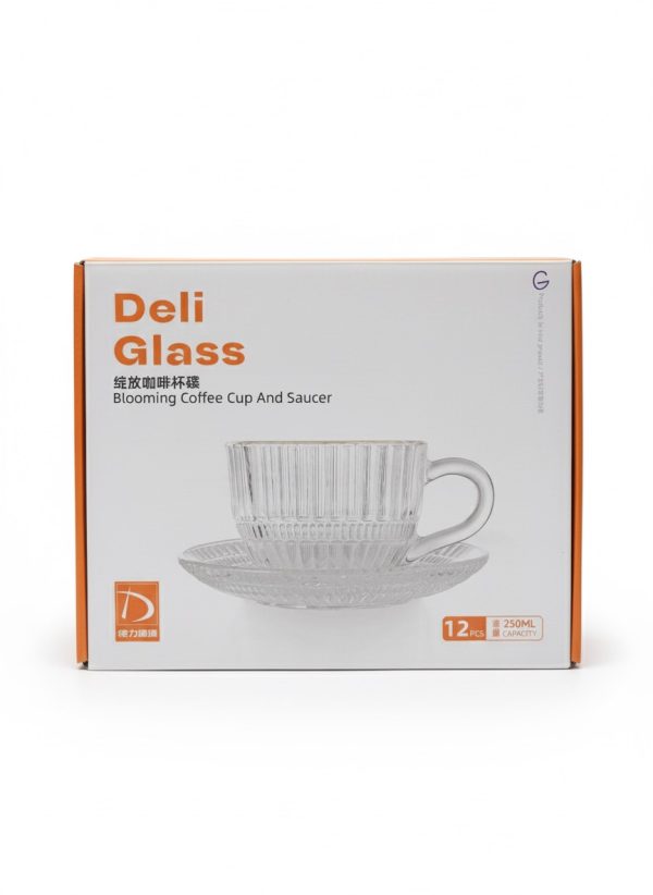 The product is a Deli Glass “Blooming Coffee Cup And Saucer” set.