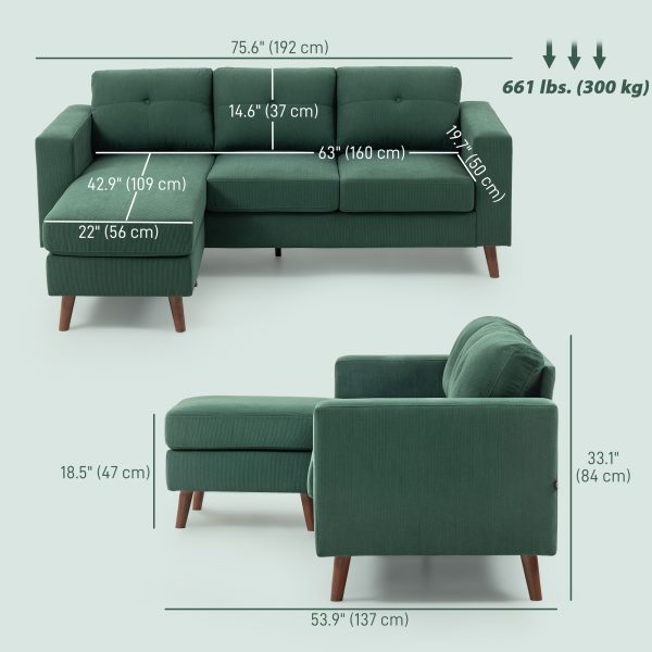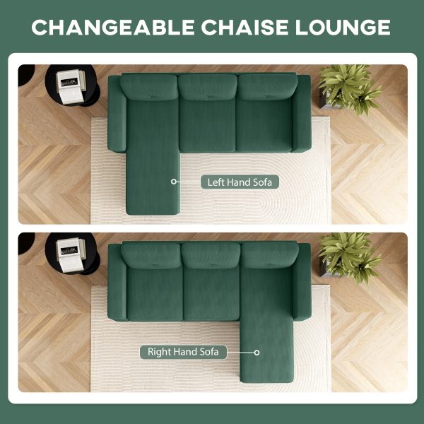 HOMCOM Sectional Sofa with Changeable Chaise Lounge, 3 Seat L-Shaped Sofa, Upholstered Couch for Small Space, Dark Green