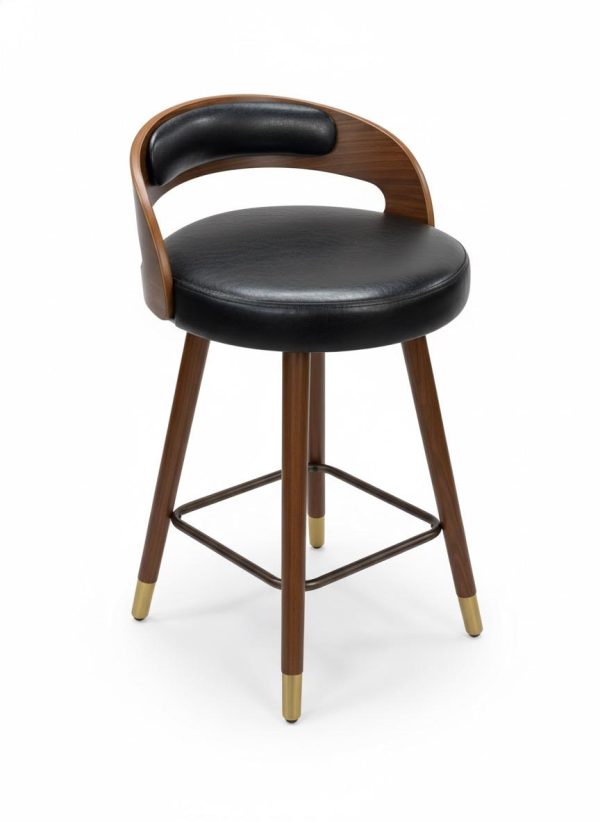 This is a mid-century modern bar stool featuring a sleek, curved wooden backrest with padded support for added comfort.
