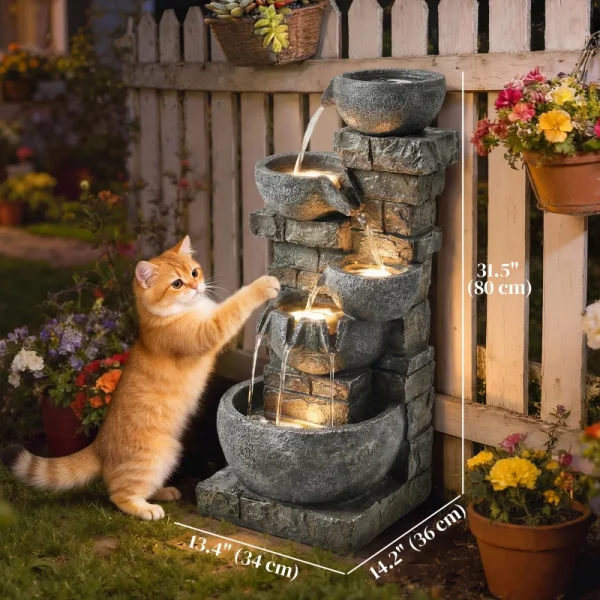 Outdoor 31.5″ Tall Water Fountain with LED Lights, 5 Tiers Cascading Water Feature for Garden Patio Home Decor, Grey