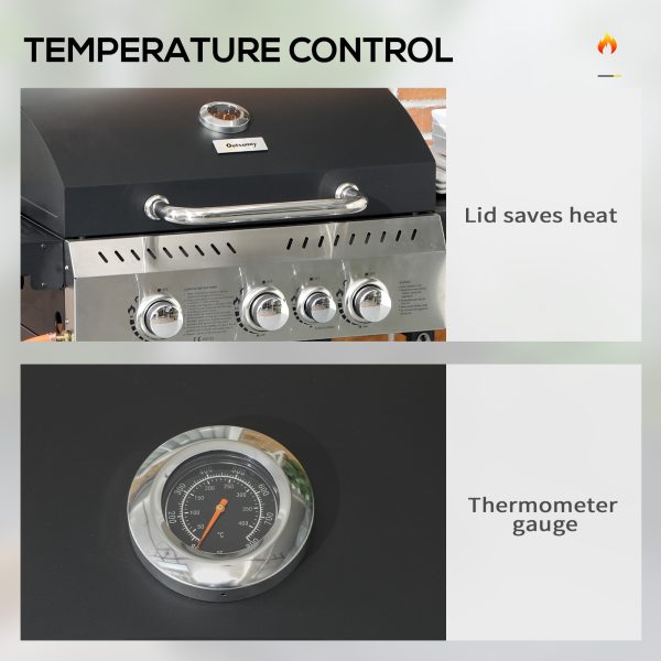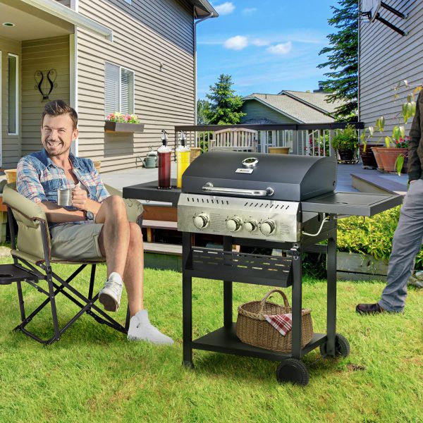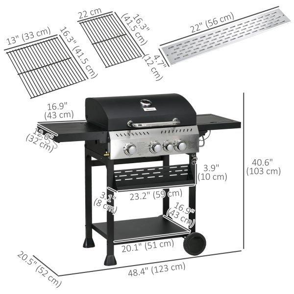 Outsunny 38,000 BTU Propane Gas Grill BBQ Cart with 3 Main Burners, 1 Side Burner, with Warming Rack, Side Prep Tables, Black