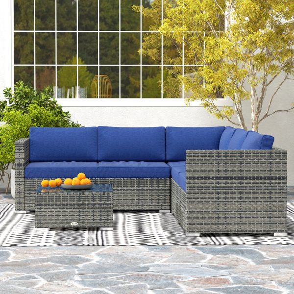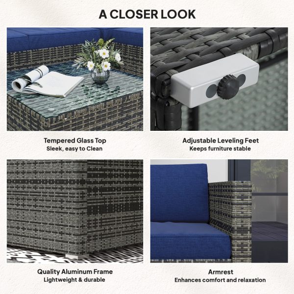 Outsunny 4 Pieces Rattan Wicker Outdoor Conversation Furniture Set w/ Corner Sofa Loveseats Coffee Table Cushions, Navy Blue