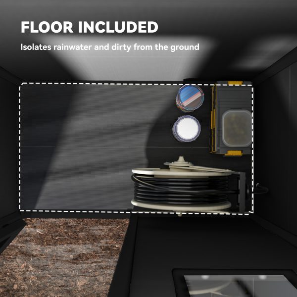 • Resin Construction: This tool shed is crafted from polypropylene resin plastic and reinforced with steel, providing long-lasting durability. It resists peeling, rotting, and rusting and never needs painting.
