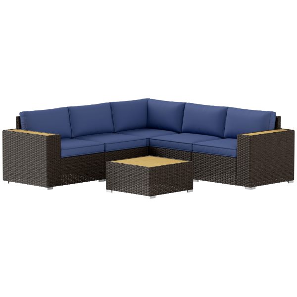 Outsunny 6 Pieces Outdoor Rattan Patio Furniture Set with Corner Sofa, Wood-Plastic Coffee Table, Navy Blue