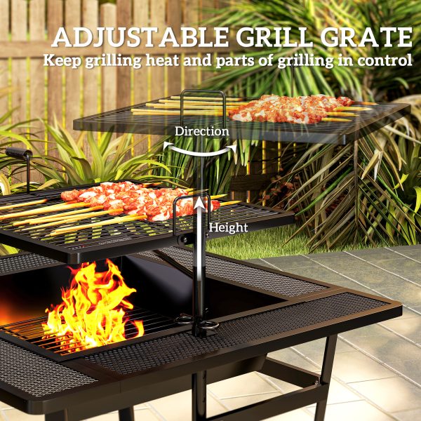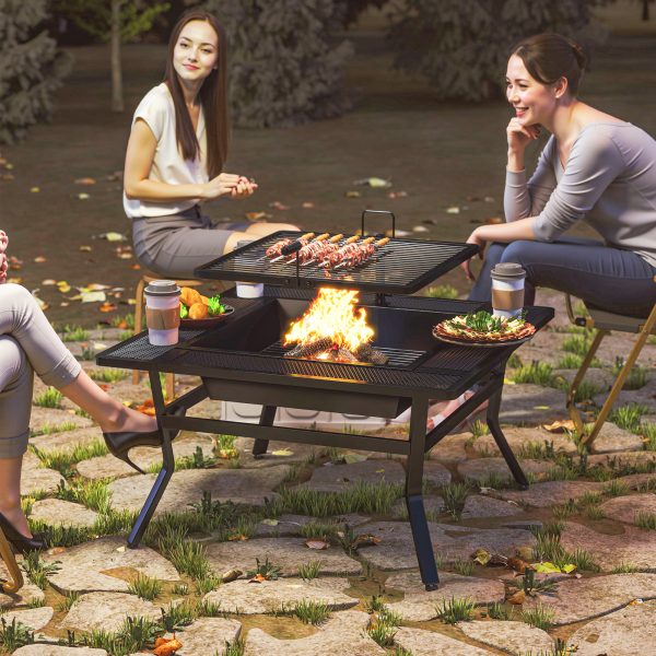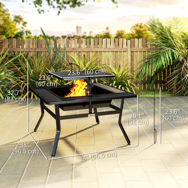 Outsunny Square Outdoor Fire Pit Firepit with Adjustable Grill Grate, Wood Fire Pit with Adjustable Foot Pads, Outer Ledge, Poker for Backyard Bonfire Picnic, Black
