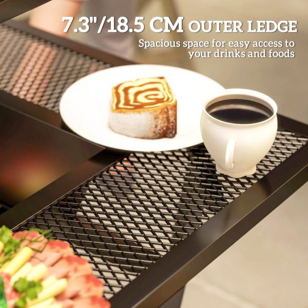 • Grilling Table with Adjustable Foot Pads: Features a 7.3″ (18.5 cm) width outer ledge around the center fire place for easy access to drinks and foods. The adjustable foot pads keeps your fire pit stable on uneven grounds