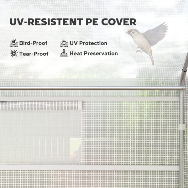 Discover the joys of year-round gardening in the spacious interior of the Outsunny tunnel Greenhouse. This walk-in greenhouse ensures your plants thrive in any weather, featuring a convenient roll-up door and large mesh windows for optimal ventilation. The robust 140 gsm PE cover bathes your greens in 85% sunlight while guarding against sun scorching. Great for every green thumb looking for a spacious garden tunnel to cultivate their garden polytunnel paradise.