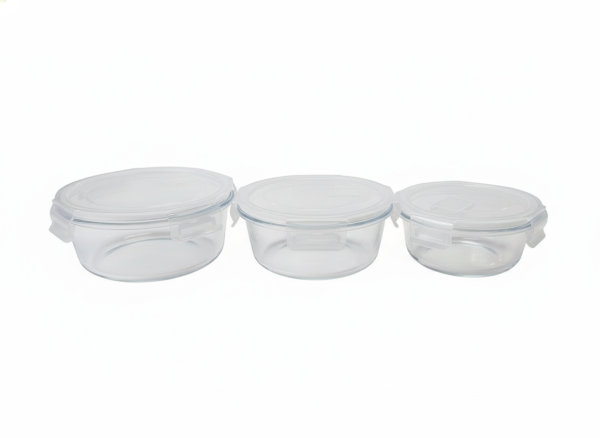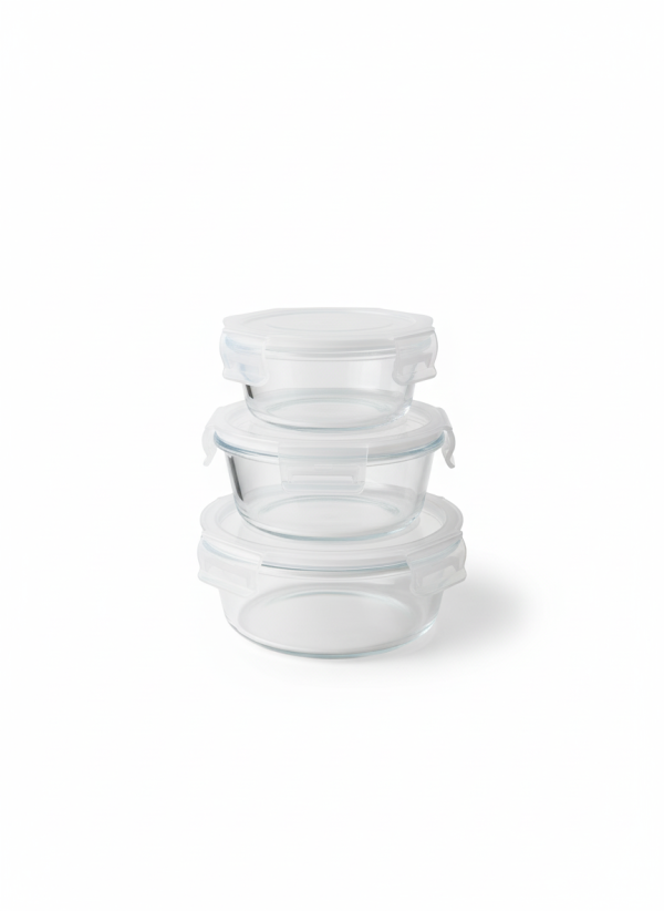 The product in the image is a set of glass food storage containers with snap-on lids. These containers are often sold under brand names like LocknLock or Clearlock.