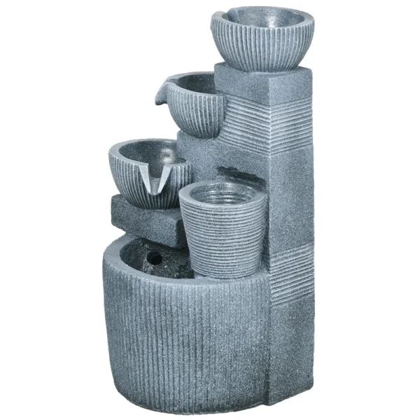 Enhance your garden with this 4-tier outdoor fountain, an excellent choice for decoration. Its realistic look is well-suited for rustic or Zen gardens. The included pump keeps independent water circulation, maintaining a constant flow of gurgling water. The fountain also features 4-level waterfalls and LED lights at 3 levels. Use the cascading bowls with a natural stone look to add natural beauty to your space.